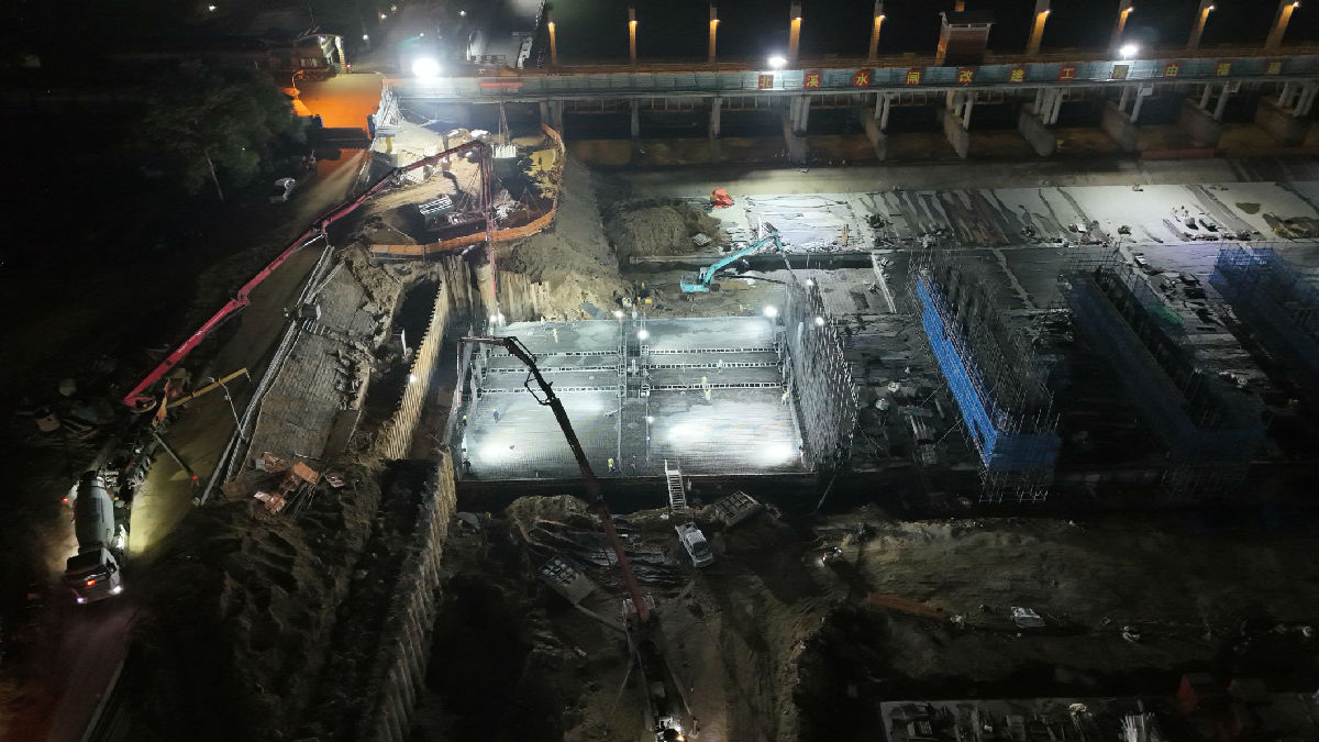 2024年12月25日,北港水闸完成首块闸室底板浇筑,正式拉开了北港水下主体结构施工序幕。为确保今年汛前如期完成北港水下部分作业,春节期间,百余名建筑工人及现场管理人员坚守岗位就地过年,加班加点抢抓进度。截至目前,累计完成混凝土浇筑7万立方米。下一步,参建各方将协同推进闸墩及消力池等建设,确保汛前完成水下主体部分施工。