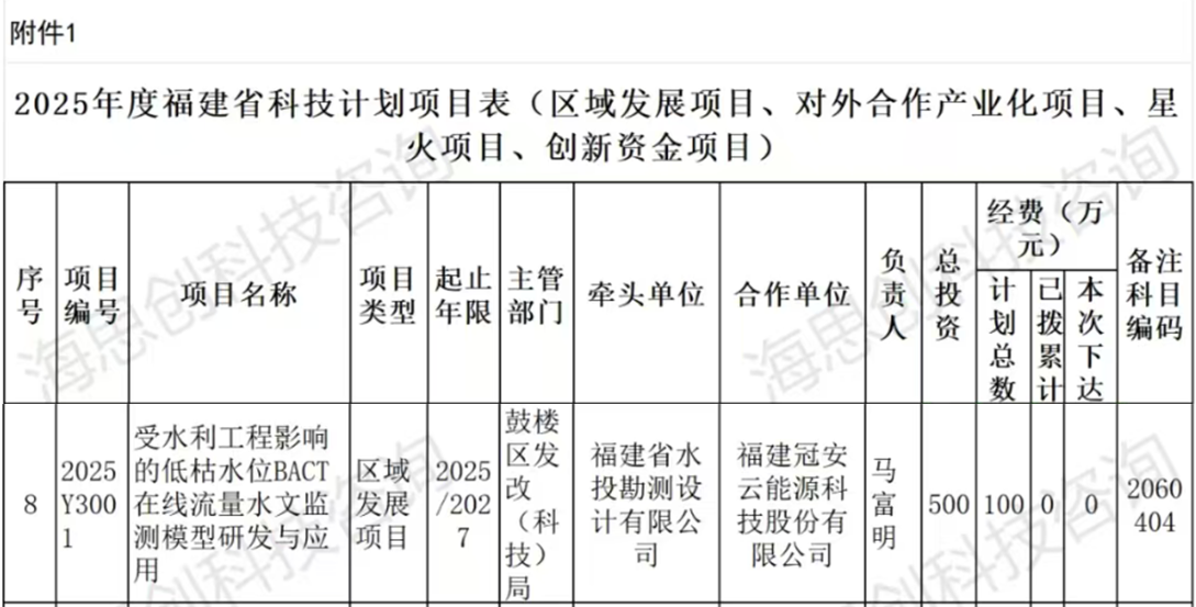 近日,福建省科学技术厅发布《福建省科学技术厅关于下达2025年度区域发展项目等省科技计划和经费的通知》,水投设计公司主导申报的《受水利工程影响的低枯水位BACT在线流量水文监测模型研发与应用》科研项目正式获批为省区域发展项目,可获科研补助经费100万元。