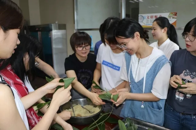 上午10点,包粽子活动正式开始,大家围在一起,纷纷露出看家本领,卷粽叶、放糯米、扎线口,巧手翻飞,气氛异常活跃。