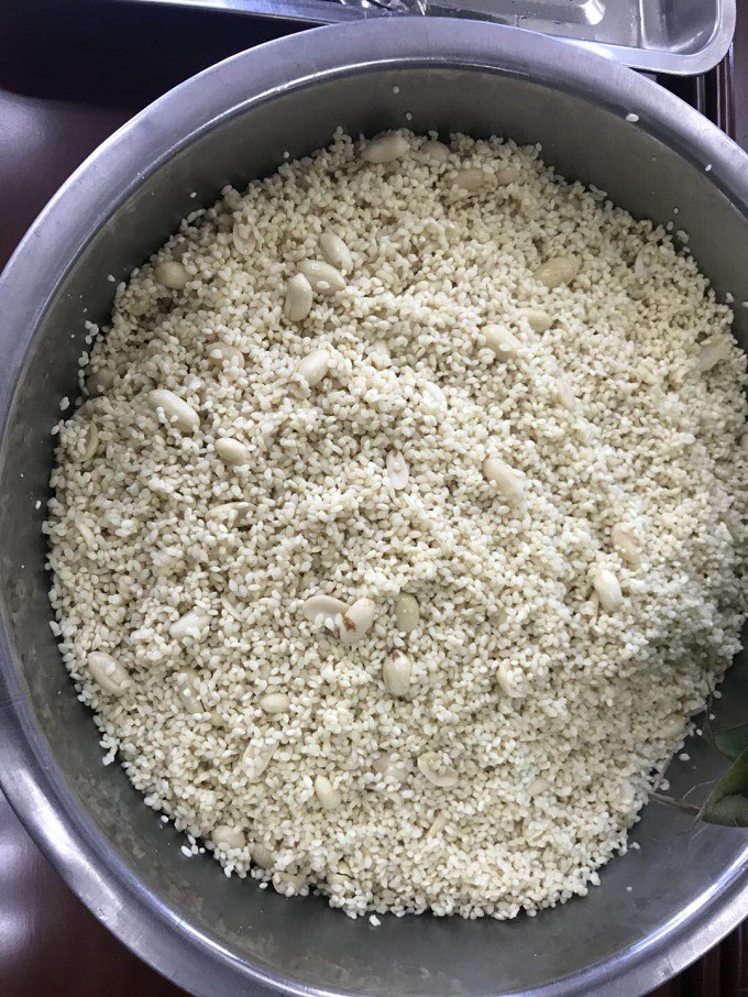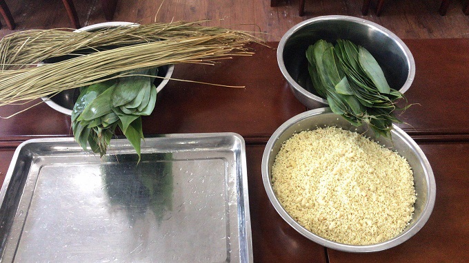 当天一大早,工会人员就提前摆好桌椅,把泡好的糯米、花生、莲子等食材整齐地摆放在桌上。