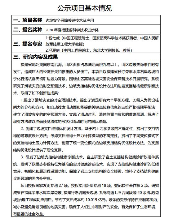 我司作为第1完成单位参与完成的“边坡安全保障关键技术及应用”项目拟申报2020年度福建省科学技术进步奖,现根据《福建省科学技术奖励委员会办公室关于2020年度福建省科学技术奖提名工作的通知》(闽科奖办〔2020〕11号),对该项目基本情况进行公示(详见附件),公示时间为2020年12月15日-20日。